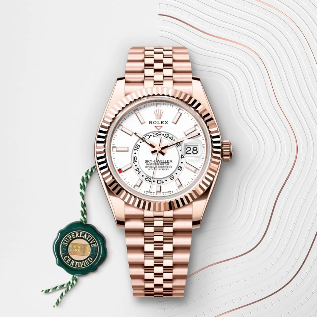 The Rolex fluted bezel is a mark of distinction. Originally, the fluting of the Oyster bezel had a functional purpose: it served to screw the bezel onto the case, helping to ensure the waterproofness of the watch. It was therefore identical to the fluting on the case back, which was also screwed onto the case for waterproofness, using specific Rolex tools. Over time, the fluting became an aesthetic element, a genuine Rolex signature feature. Today the fluted bezel is a mark of distinction, always in gold. The Sky-Dweller is equipped with a mechanism of interaction between the rotatable bezel, the winding crown and the movement: the Ring Command system, which allows the user to select the watch's functions one-by-one and to set them easily, quickly and securely.
