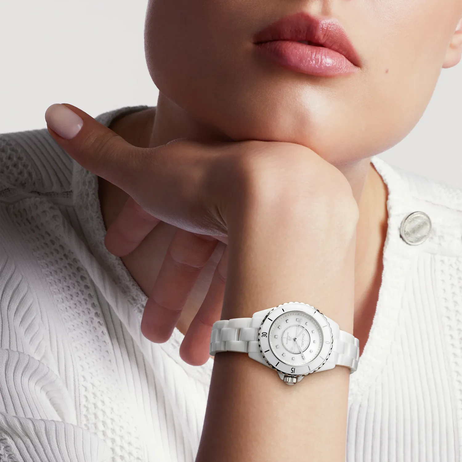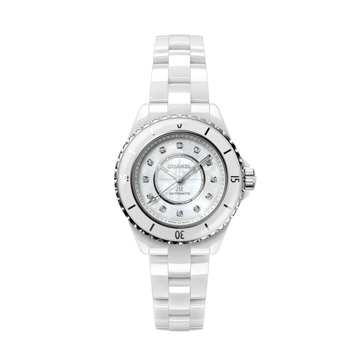 33mm white ceramic case, self-winding movement, white ceramic bracelet
