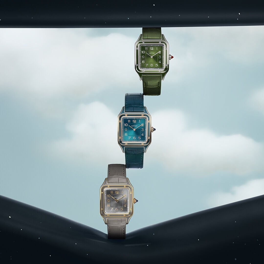 Le nouveau trio de couleurs de la collection Santos-Dumont, avec leurs cadrans en laque colorés et leurs boîtiers en platine, or rose et jaune, offrent un éventail de choix pour les amateurs de montres urbaines et sophistiquées. Chaque montre, alimentée par le calibre 430 MC de Cartier (base Piaget 430 P), affiche des chiffres arabes en harmonie avec le coloris du boîtier. Ces pièces viennent montées sur des bracelets en alligator et sont toutes étanches jusqu’à 30 mètres.