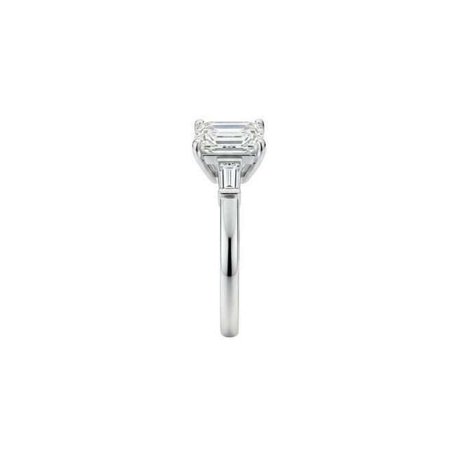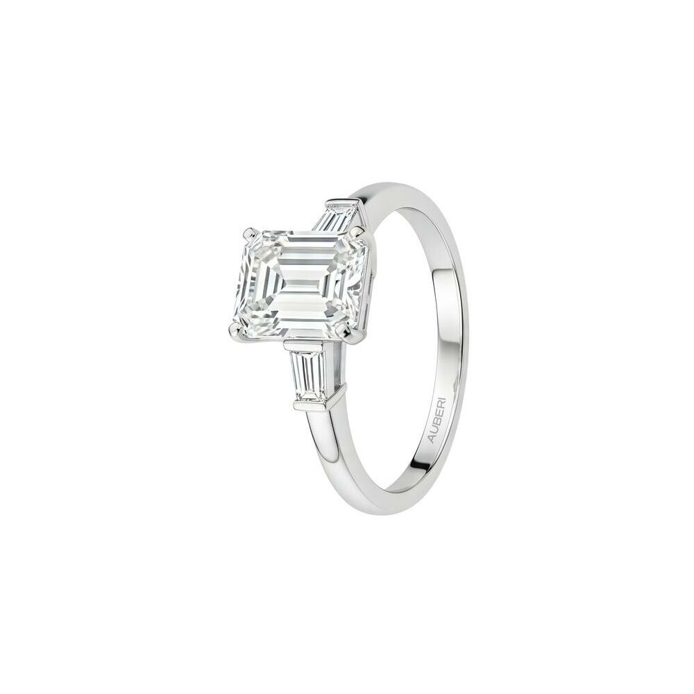 Bague Liz en or blanc palladié, diamant taille émeraude de 1.90ct et 2 diamants baguette de 0.35ct