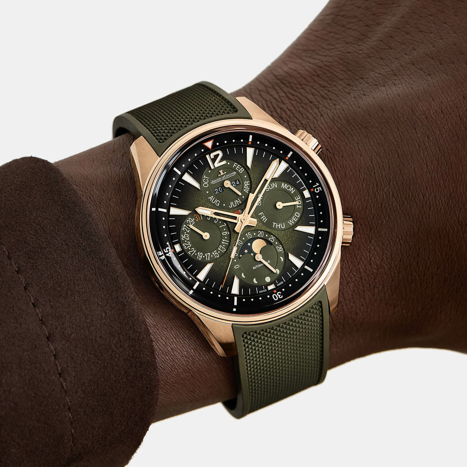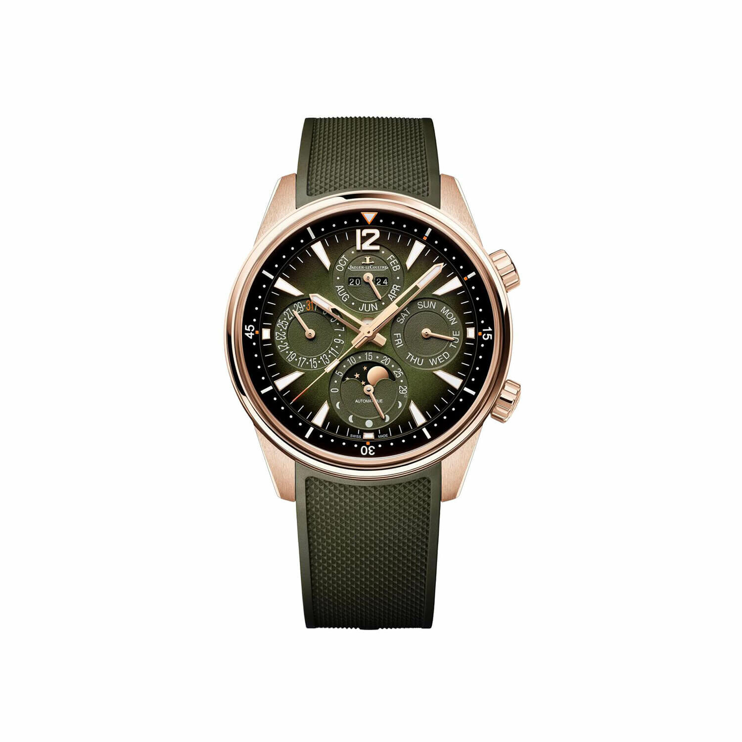 Le cadran vert laqué dégradé, étanche à 100 m, se marie parfaitement au bracelet caoutchouc vert interchangeable avec un bracelet cuir alligator noir, disponible dans notre sélection de montres Jaeger-LeCoultre pour hommes. Découvrez également l’élégance de la gamme Polaris et laissez-vous charmer par nos modèles dédiés aux dames dans la catégorie montres Jaeger-LeCoultre pour femmes.