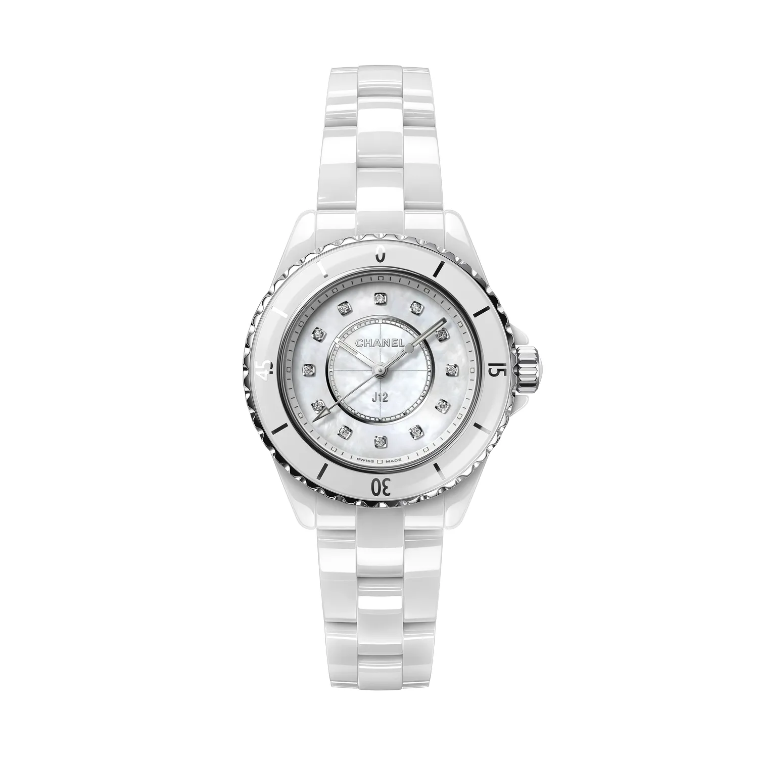 Boîtier en céramique blanche 33 mm, mouvement à quartz, bracelet céramique blanche