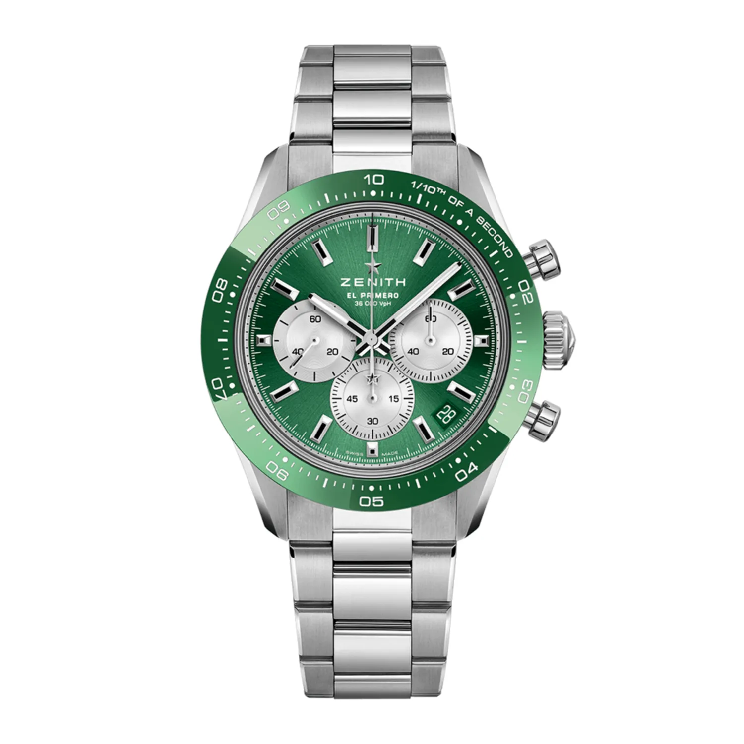La Chronomaster Sport repousse une fois de plus les limites de la précision haute fréquence. Alliant l'esprit du calibre A386, la forme de la De Lucca et les éléments haute fréquence inégalés qui font la renommée d'El Primero dans les chronographes sportifs depuis plus de 50 ans, ce modèle représente le summum de l'héritage exceptionnel de Zenith en matière de chronographes automatiques. Ce calibre offre des performances dignes d'une nouvelle génération, marquant la première amélioration significative du mouvement El Primero original sorti en 1969. La lunette, qui affiche une mesure au 1/10e de seconde, est de la même couleur que le cadran vert, et cette nouvelle combinaison de couleurs crée une présence particulière qui attire l'attention.